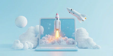 A captivating image shows a rocket launching from a laptop screen against fluffy clouds, symbolizing innovation and creative exploration in a serene blue background that inspires dreams