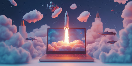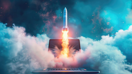 A stunning visual of a vibrant rocket launching from a laptop screen, surrounded by fluffy clouds and a colorful nebula background, symbolizes innovation and creativity.