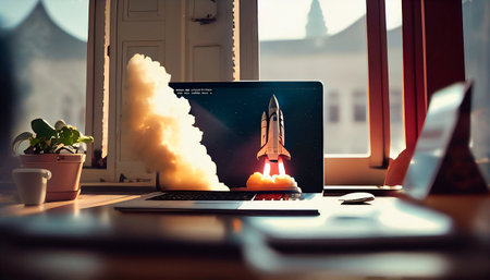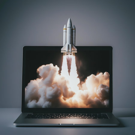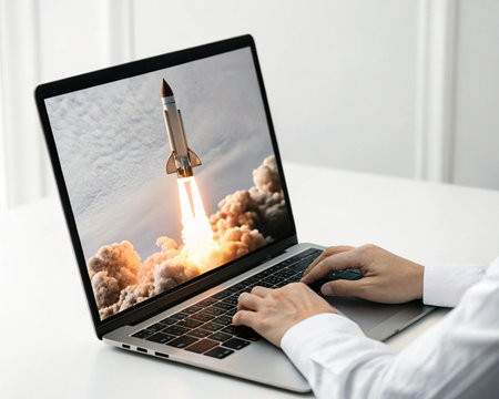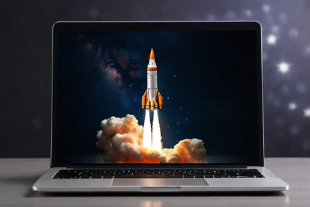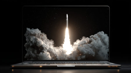 close-up of laptop screen, with rocket blasting off into the sky, created with generative ai