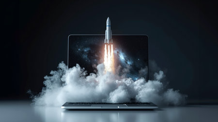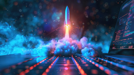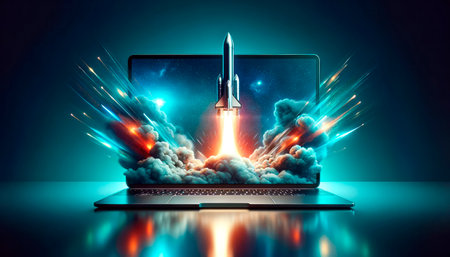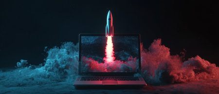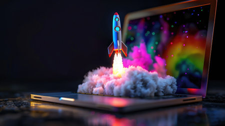A cinematic composition of laptop with rocket launching from its screen, surrounded by colorful smoke, evokes sense of innovation and creativity