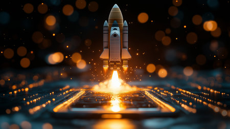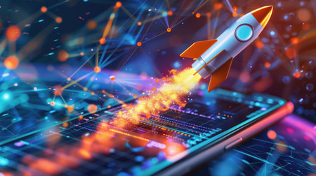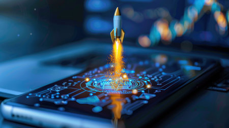 Futuristic rocket emerges from digital device, showing new business or tech breakthrough
