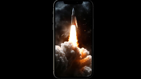 Rocket taking off from mobile phone screen on black background. Created with Generative AI technology