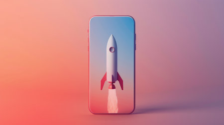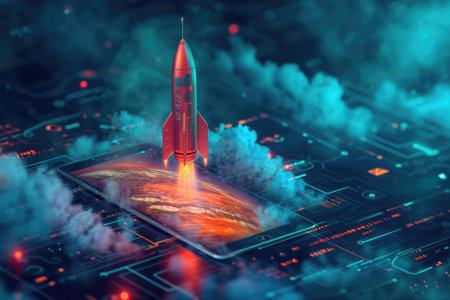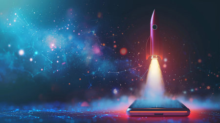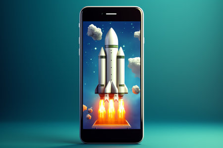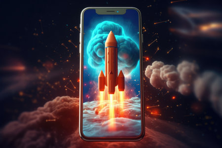 Rocket launching from smartphone in creative digital artwork at home office setting