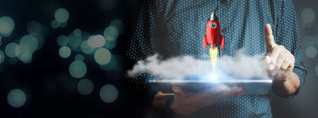Startup business concept, Businessman holding tablet and icon transparent rocket is launching and soar flying out from screen with network connection on dark blue modern background.