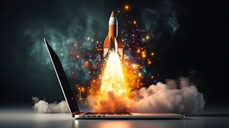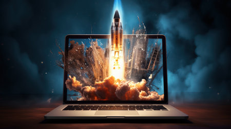Launching space rocket from laptop screen. Generative Ai technology