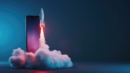 Rocket launching from a smartphone screen. Startup success, business innovation, modern technology concept background with free place for text