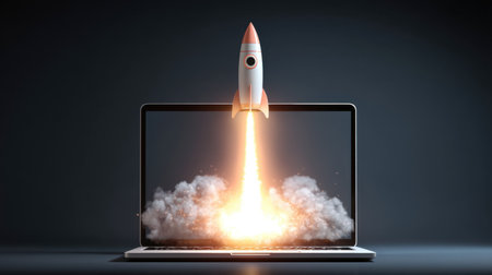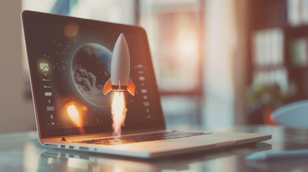A laptop screen displays a rocket launching into space. The rocket is brightly colored and has a futuristic design. The image is abstract and minimalist, and it evokes a sense of hope and imagination. Generative AI