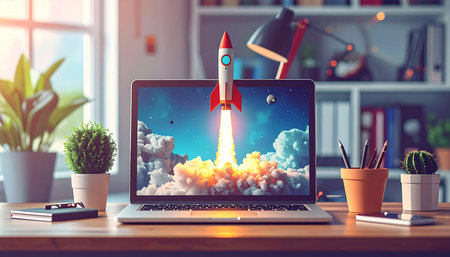 A vibrant illustration showcasing a rocket launching from a laptop screen, symbolizing innovation and creativity in technology and business development.