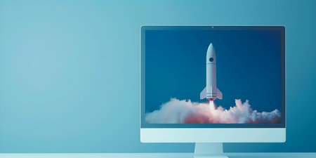 Computer screen displays a rocket symbolizing startup success against a blue backdrop. Concept Startup Success, Rocket Icon, Computer Screen, Blue Background