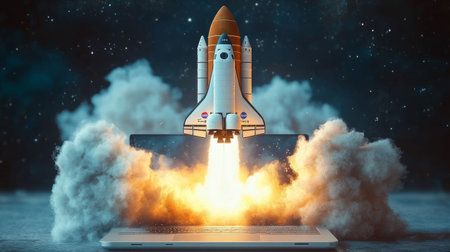 Dynamic shuttle launch from computer screen with vibrant effects, Generative AI