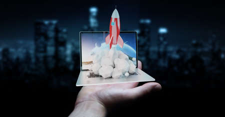 Laptop with flying rocket on screen. Start up concept. 3D Rendering