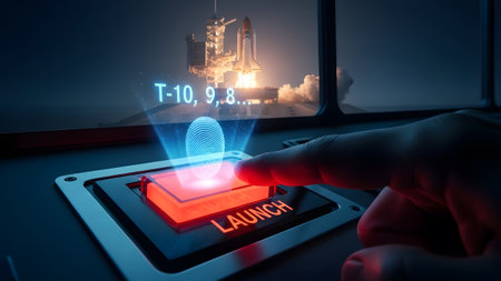 Finger pressing a red launch button with a spaceship countdown hologram. Clear details and vibran...