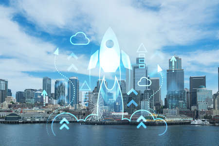 Seattle skyline with waterfront view. Skyscrapers of financial downtown at day time, Washington, USA. Startup company, launch project to seek and develop scalable business model, hologram