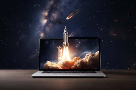 Laptop screen displays a vibrant blue backdrop with a rocket launching. Concept Space Exploration, Technology, Innovation, Futuristic Concepts