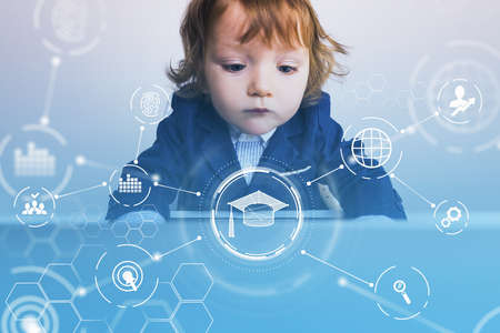 A boy kid working on laptop and choosing future educational perspectives in corporate career. Research of best ranked university to study master in business administration programs, postgraduate level