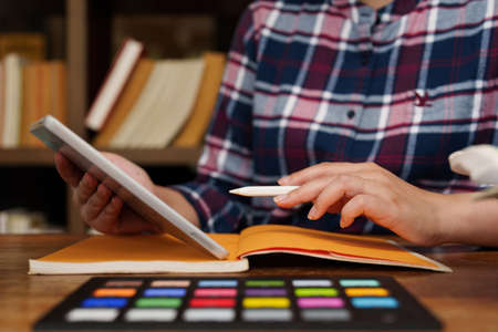 Side view, Female freelancer using a smart digital tablet touchpad in her home living room. close-up