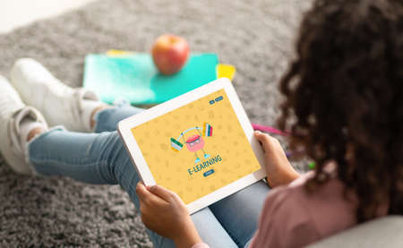 E-Learning. African American Schoolgirl Using Digital Tablet At Home For Online Lesson