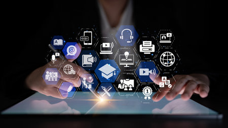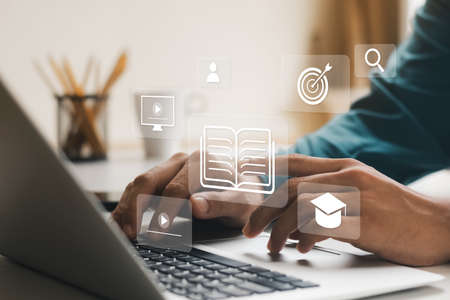 E-learning and Online Education for Student and University Concept. Graphic interface showing technology of digital training course for people to do remote learning from anywhere.