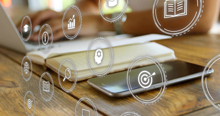 Resting phone on wooden workstation notebook behind hands typing laptop overlay icons wearing top. Device, workspace, warm, bokeh, analytics, learning, productivity