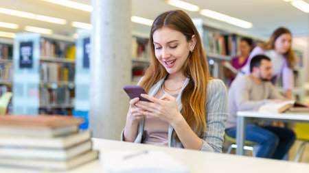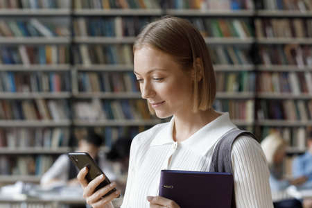 Positive millennial student girl using app on smartphone in college library, browsing, consulting internet for research study, chatting online, making call, holding mobile phone