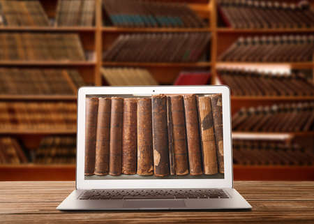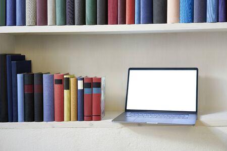 Laptop with blank screen on floor. interior background, bookshelf, library.Educational technology concept.