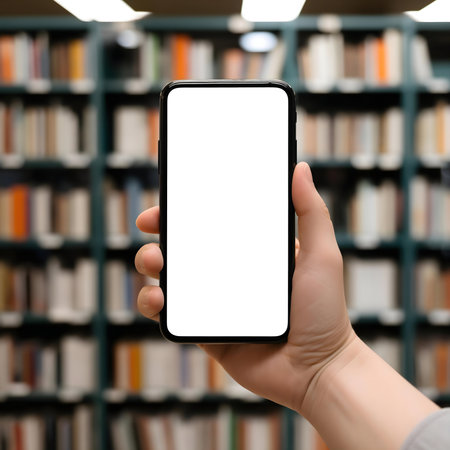 A hand holds a smartphone with a blank screen in front of a blurry library background.