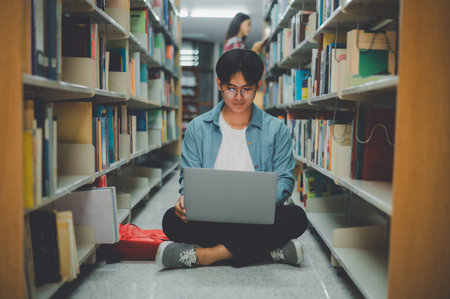 Asian young Student in casual suit doing homework and using technology laptop in library of university or college with various book and stationary over the book shelf background, Back to school