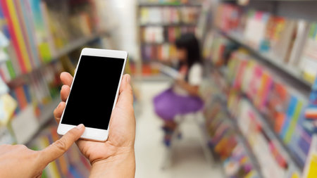 Hand using touch screen mobile phone with blurred background in Bookstore
