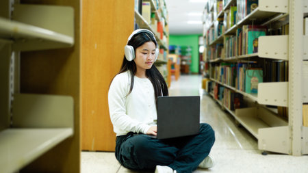 Blurred youngster female college student sitting on the floor at book shelf while listening the music and reading from laptop in library, education concept