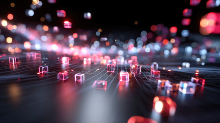 Cubic particles in free space and red light stripes. Abstract futuristic technology concept. 3D render