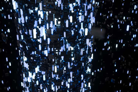 3d render. Abstract dark blue background with neon light like cyberpunk night city. Network of different sizes blocks as light bulbs.