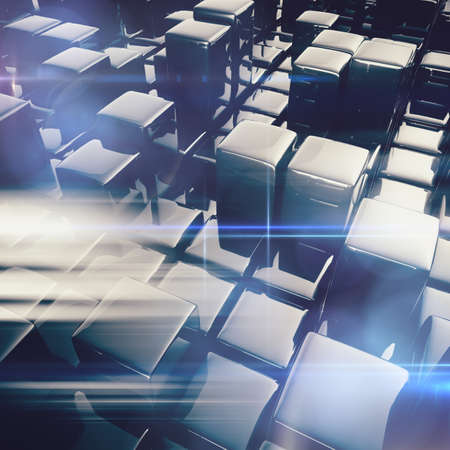 Abstract background from metal cubes with random offset effect. The glass inside the cubes reflects light. 3d illustration