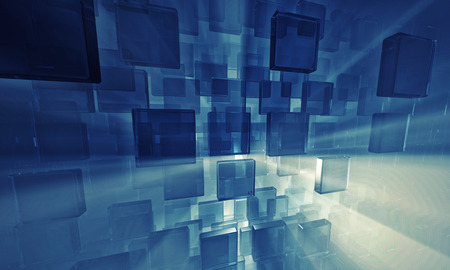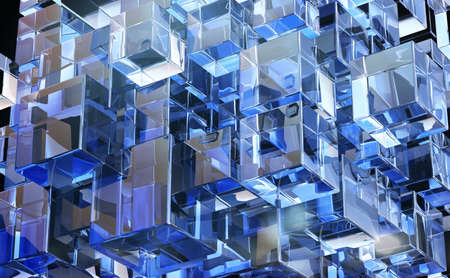 Abstract 3d rendering of chaotic cubes. Blue and black background.