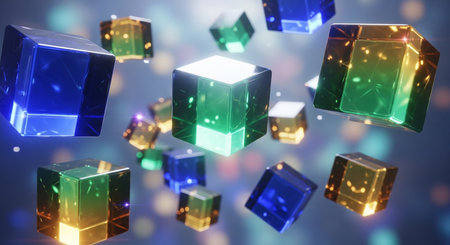 An artistic rendering of several translucent cubes floating in space, with vibrant colors and intricate details, creating a futuristic and abstract visual.