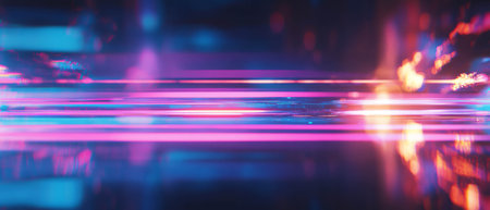 Light streaks create vibrant reflections on a wet surface during a rainy atmosphere