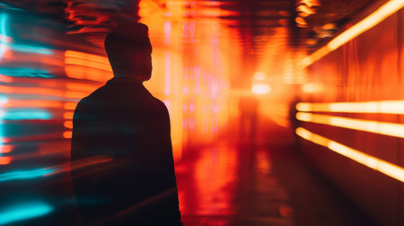 A man, illuminated by bright lights, stands in a dark tunnel. The contrast between light and darkness creates a dramatic scene.
