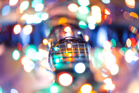bright multicolored festive lights of a garland around a guitar neck, blurred background