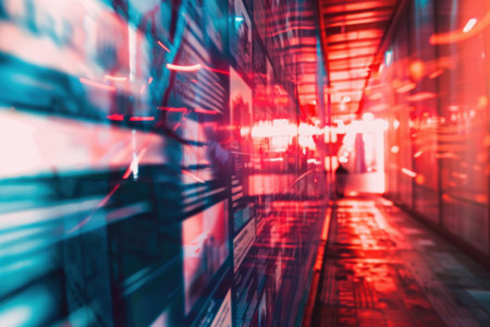 A captivating display of digital lights creates an abstract tunnel effect, filled with dynamic hues of red and blue. The lights pulsate and swirl, evoking a sense of movement and energy, as if inviting viewers to step into this vivid realm.