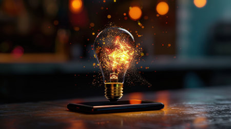Network bright idea with light bulb. Hand hold white smartphone with digital hologram light bulb sign on city dark blurred background. Innovation and creative idea concept