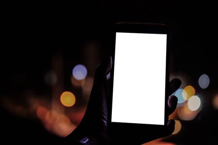 hand holding mobile smart phone with blank screen with bokeh night light background