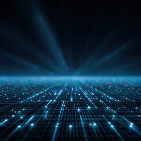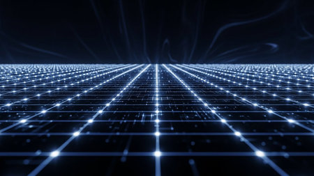 A digital grid of glowing blue lines recedes into a dark, abstract background with subtle light streaks, creating a sense of depth and futuristic...