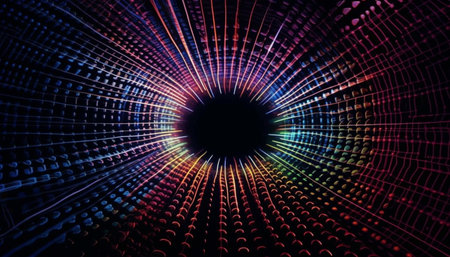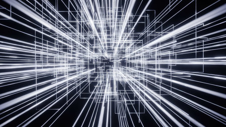 Digital tunnel with glowing binary code abstract technology futuristic design data visualization glowing lines dark background light rays computer graphics digital art cybernetic theme glowing