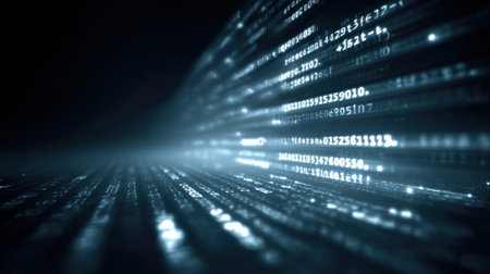 Dive into the world of technology with this abstract image featuring a digital matrix filled with luminous numbers and codes, representing data processing and innovation.