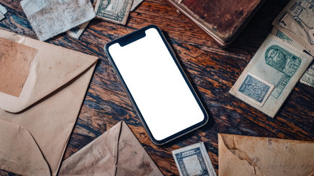 The concept of synthesis of ancient technology and modernity. Phone mockup. Top view of a phone with an empty screen lying on a table next to a pile of old envelopes and stamps. This scene suggests a moment of contemplation or reflection.