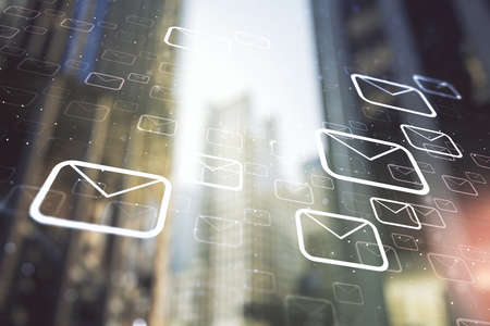 Abstract virtual postal envelopes illustration on office buildings background. Email and communications concept. Multiexposure