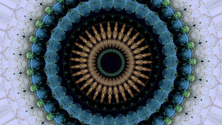 Symmetrical pattern of the mandala. Blue, yellow and orange palette. Computer generated graphics.