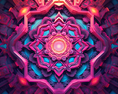 A mesmerizing neon mandala with intricate patterns and vibrant colors radiating energy and symmetry. The glowing lines and geometric shapes create a dynamic and visually stunning abstract artwork that captivates the viewer.. AI Generation