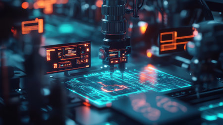 A futuristic manufacturing scene showcasing robotic automation in a high-tech factory with intricate circuit boards.