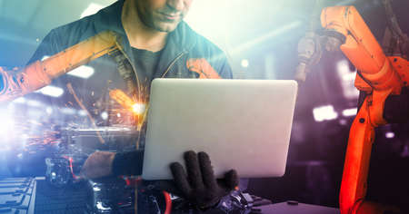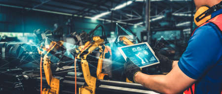 With digital tablet, engineer checks welding robotics automatic arms machine. Monitoring system software in intelligent factory industrial.