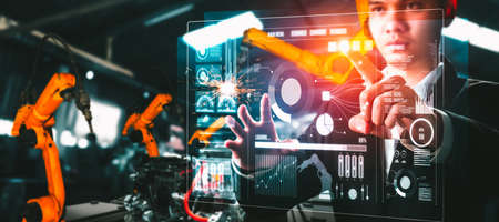 Engineer controls robotic arms by augmented reality industry technology application software. Smart robot machine in future factory working in concept of Industry 4.0 or 4th industrial revolution.